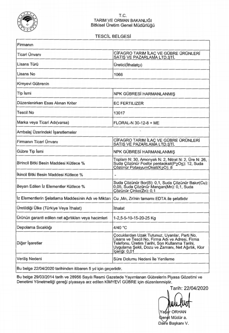 Floral N, yapraklar tarafından kolaylıkla alınabilecek bir formülasyon olup, özellikle bütün süs bitkileri ve tarımsal ürünlerin ilk gelişim dönemleri için uygundur.