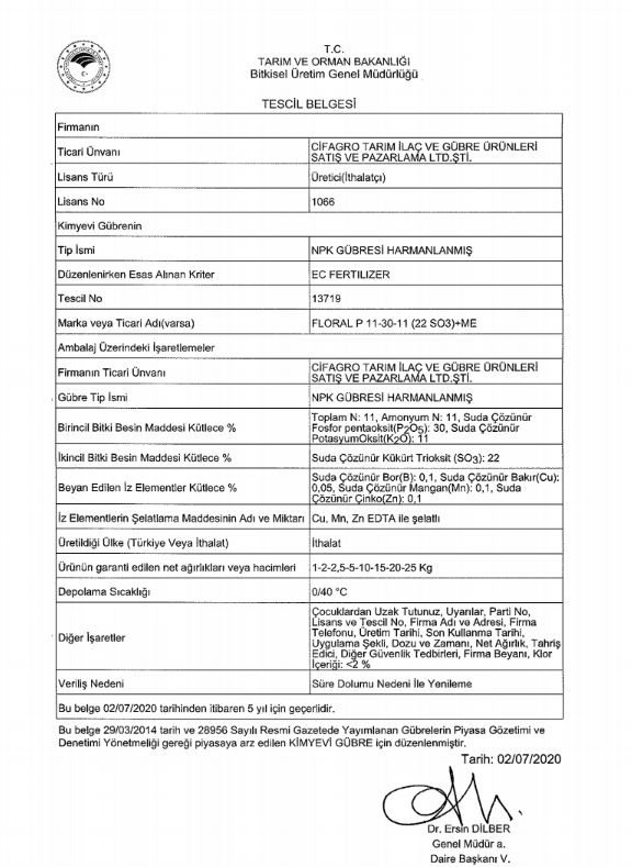 Floral P, özellikle vejetatif dönemin ilk aşamalarında ön çiçeklenmeden ilk meyve, tüm süs bitkileri, fidanlık ve tarım ürünlerinin oluşumu için yapraktan emilim için bir preparatıdır. .