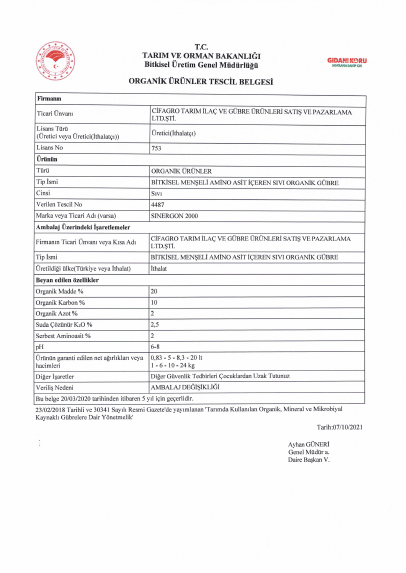 SINERGON 2000 büyüme ve verim artışını teşvik eden “biyolojik olarak aktif” maddeler bakımından zengin bir organik formülasyondur.